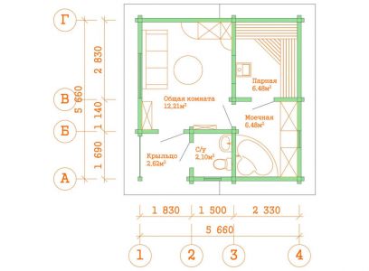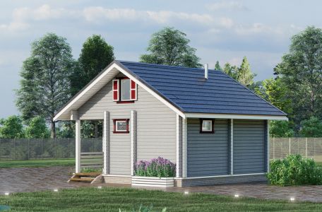 Издалека эту баню из профилированного бруса можно принять за небольшой загородный домик. Однако подойдя поближе и, конечно же, заглянув внутрь, всё встанет на свои места — это современная, экологичная, комфортабельная баня из профилированного бруса. Заслуживает особого внимания внутреннее пространство, так как там располагается, помимо парной и моечной, большая комната отдыха и даже сан. узел.