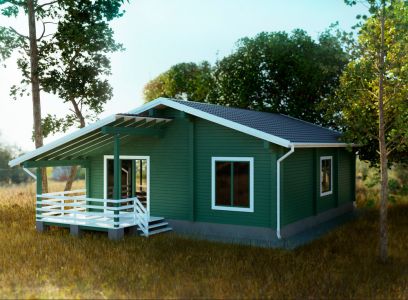 Одноэтажный дом из профилированного бруса, сочетающий классические элементы домостроения и современные тенденции. Особенно стоит отметить роскошную и просторную террасу этого экологичного и комфортного дома.